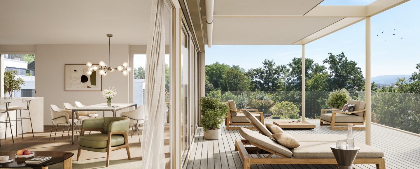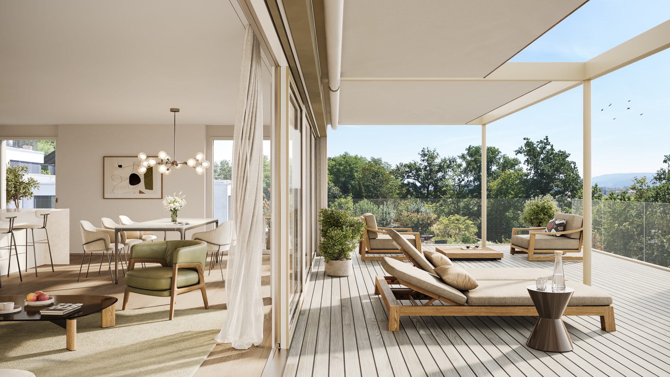 Die beiden Attikawohnungen mit 3.5 bis 4.5 Zimmern verfügen über 121.5 bis 139.0 m² Wohnfläche. Die weitläufigen Terrassen bis 103.25 m² bieten eine beeindruckende 180-Grad Panoramaaussicht.