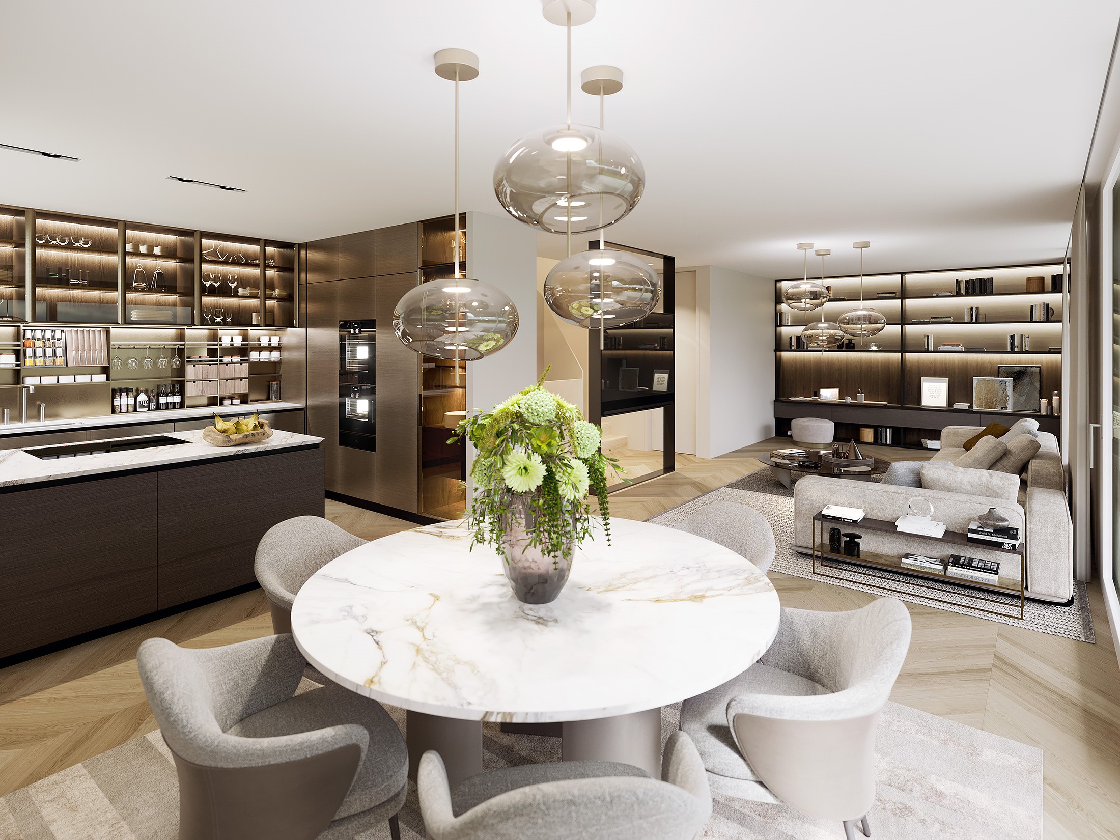 Im Erdgeschoss bilden Küche mit Kochinsel, Wohn- und Essbereich sowie ein Gäste-WC eine funktionale Wohneinheit mit guter natürlicher Belichtung durch bodentiefe Fenster.